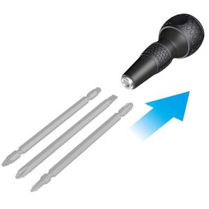 これはハンドルと刃先(軸)が別になっていて、ハンドルの先の取付部(チャック)ヘ、使おうとする大きさの刃先を差し込んで使うものです。差し替え軸が4~8本ぐらいついていますので、ちょっとしたねじ締めや、持ち歩きなどには便利なものです。