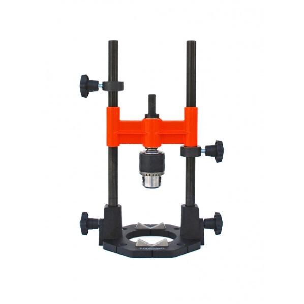 電気ドリルで垂直の穴をあけるのは難しい作業ですが、簡単確実にできるようにした器具がドリルスタンドです。図のように取り付け、レバーで電気ドリルを押し下げます。ほかに深さ調節や微妙な位置合わせも便利で正確になります。電気ドリルには連続回転用のロックボタンがあるのでこれが使えます。